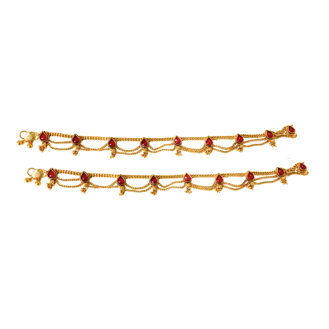 Grace your steps with this beautifully crafted gold-plated anklet, featuring vibrant red stones that add a pop of color to any traditional outfit. Perfect for weddings, festivals, and special occasions, this anklet brings charm and elegance to your every move.